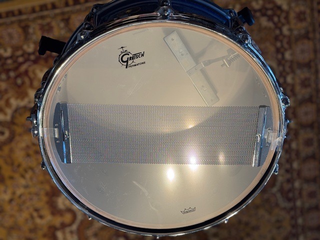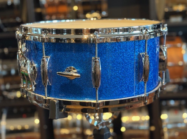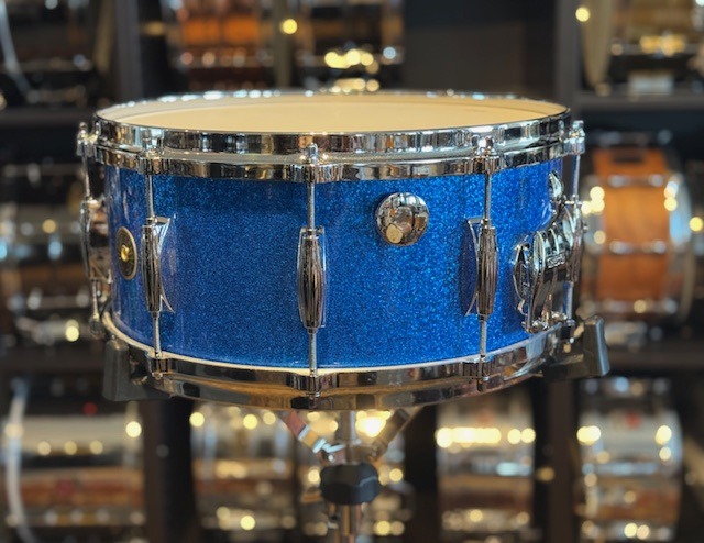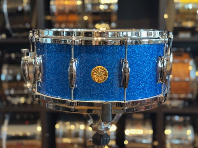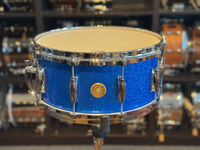 Prachtige Gertsch USA Custom met interne demper, stemsleutel en brede snaren mat. De maple Gum ketel is afgewerkt met een blue sparkle wrap.