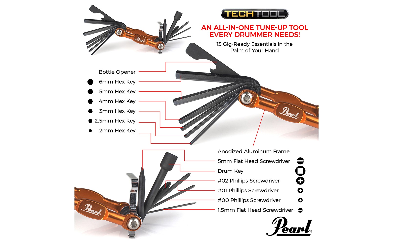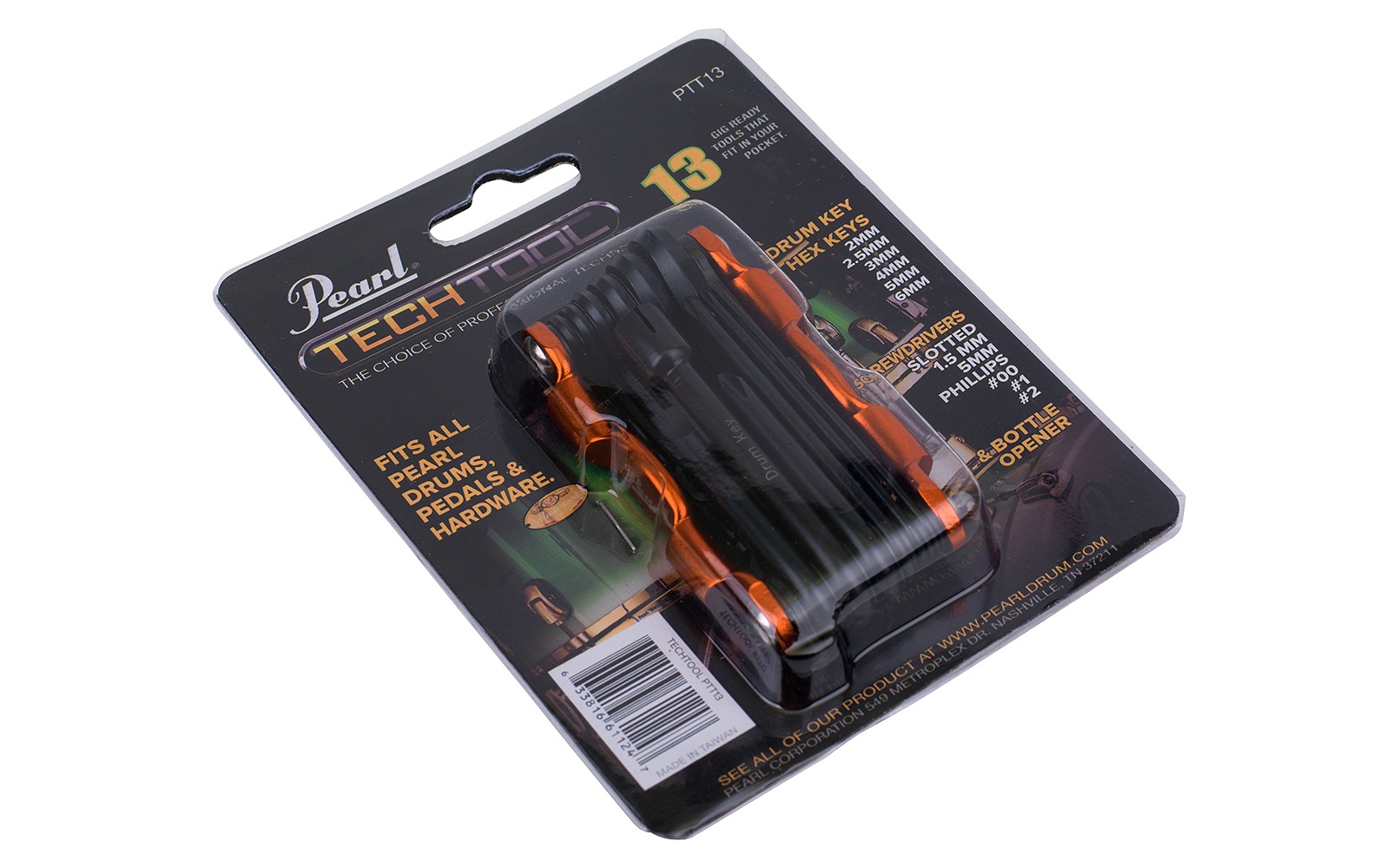 The PearlTech Tool features 13 gig-ready tools specifically selected to fit all Pearl drums, pedals and hardware.