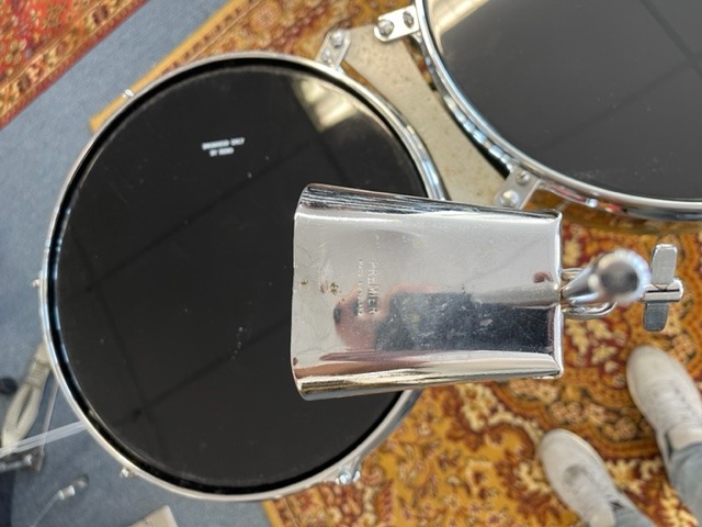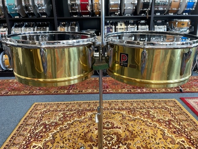 Vintage Premier timbales inclusief originele stand en cowboy. De set is in nette staat gezien de leeftijd. Er zitten nieuwe vellen op.