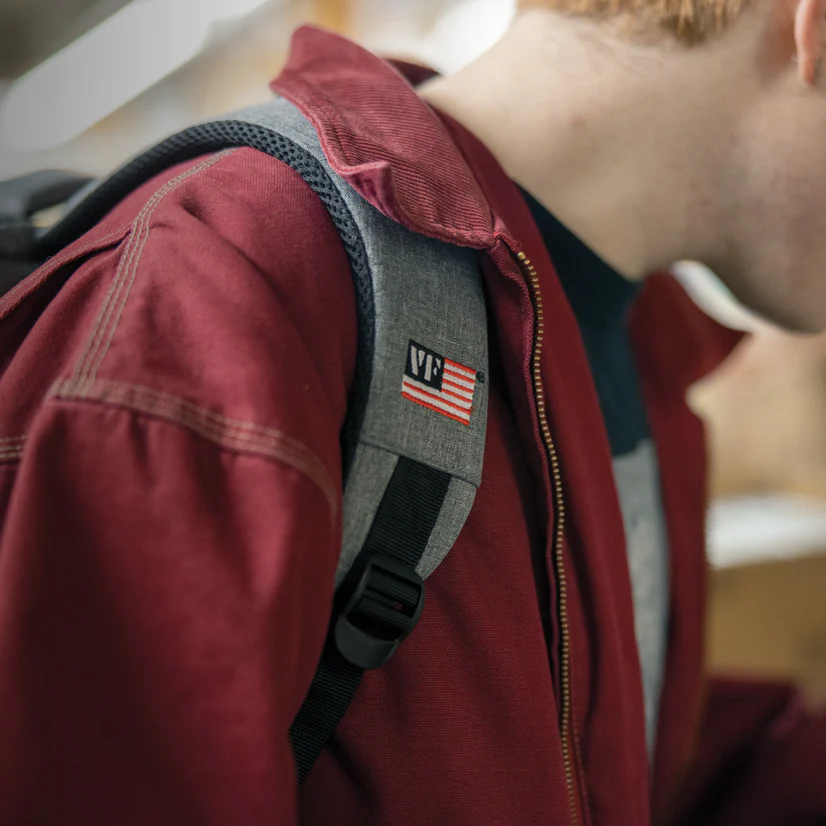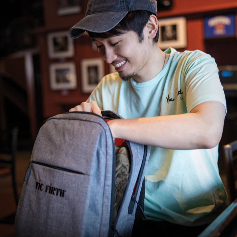 The Vic Firth Gray Travel Backpack is a unisex fashion backpack with functional details perfect for traveling drummers.