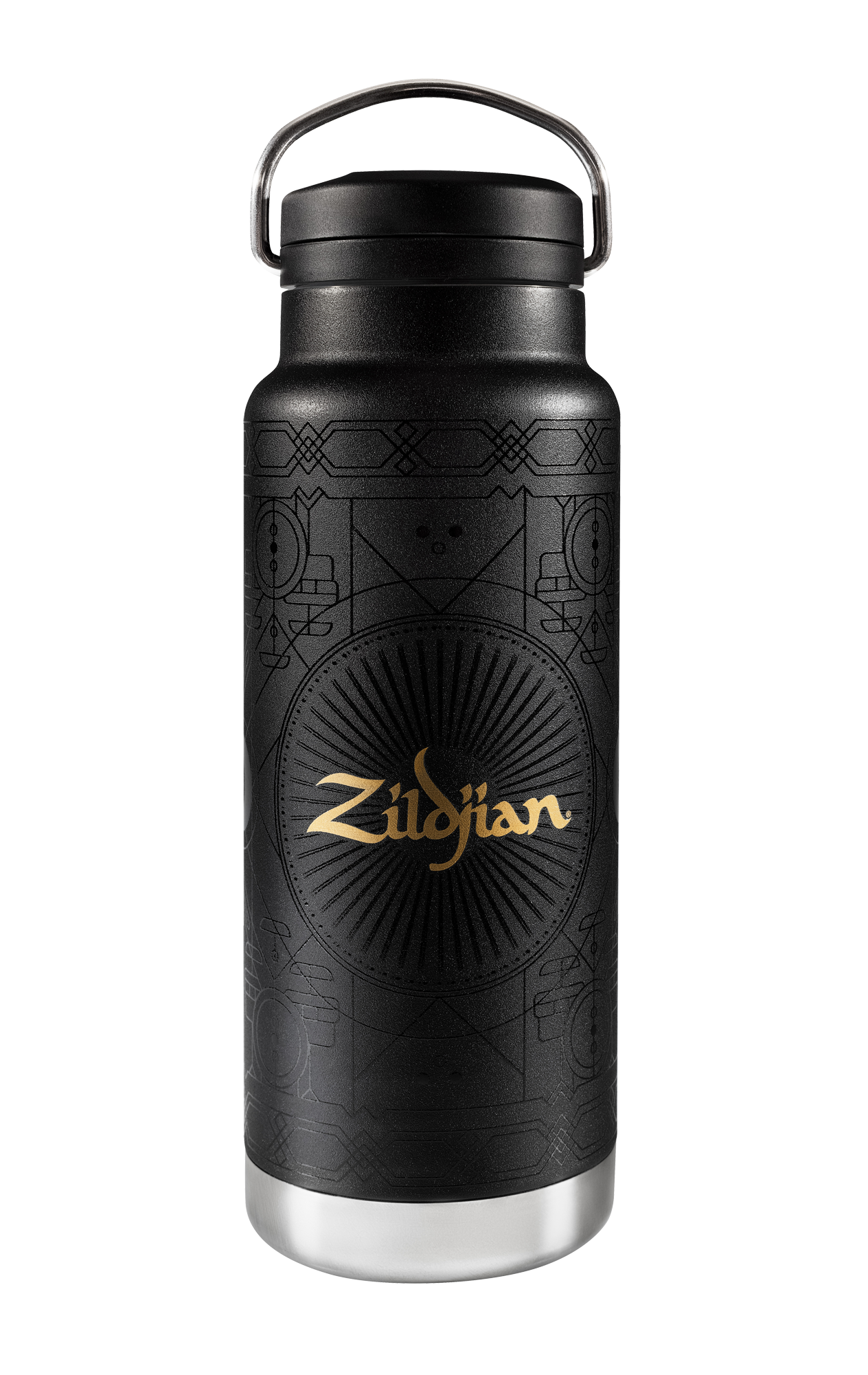 Matte black with an allover black varnish print and gold Zildjian logo, this water bottle provides the ultimate style to keep any drummer hydrated wherever they go.